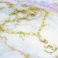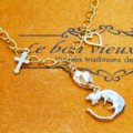 チェーンには小さなハートとロザリオをプラスして、繊細さとともに華やかさを演出しています