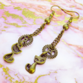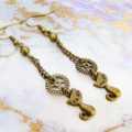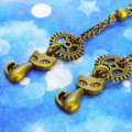 アンティークカラーの猫と歯車のモチーフを使ったスチームパンク風のチェーンピアスです
