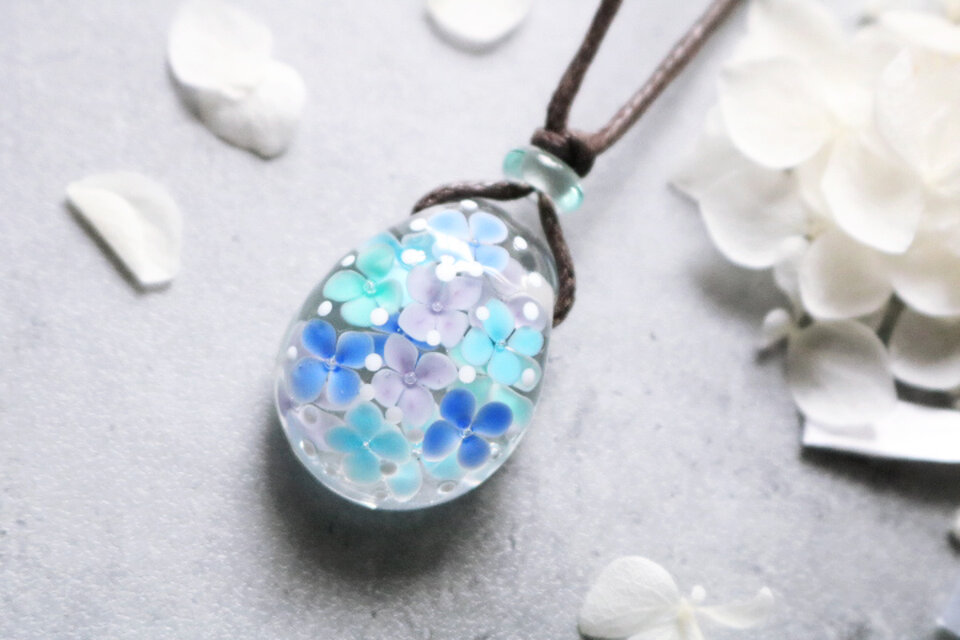バーナーワークの技法で制作した、手作りのガラスのペンダントです。