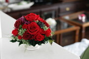 コンポート型の花器に深紅のバラをタップリと入れエレガントで華麗なアレンジに仕上げました。