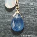 丸カンに宝石質サファイアAAAのボタンカットを下げ、此方にチェーンを通して、三個のエチオピア産プレシャスオパールを下げ、一番下にアクセントになるよう宝石質サファイアAAAのペアシェイプを下げました。