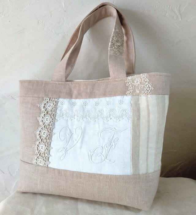 フランスの手刺繍アンティークモノグラムとエクリュリネンを使ったトートバッグです