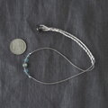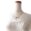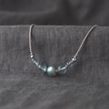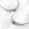 神秘的な輝きが見られるラブラドライトに透明感のある深いブルーのフローライトを合わせ、キラリと輝くシルバー色のヘマタイトを添えてグレー色のシルクコードで繋いだ上品な雰囲気のショートネックレスです。