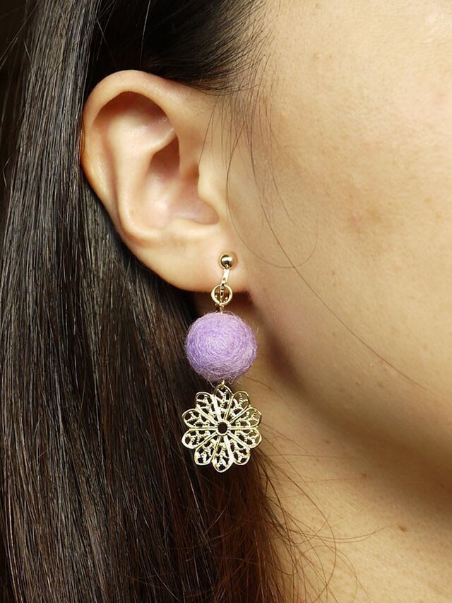 軽くてやさしい 小さなフェルトボールイヤリング/ピアス (花形パーツ付)選べるカラフル16色