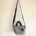 コーデュラナイロンで作った軽くて丈夫なミニショルダーバックです。ライトグレーと底部分はチャコールグレーで切り替えています。