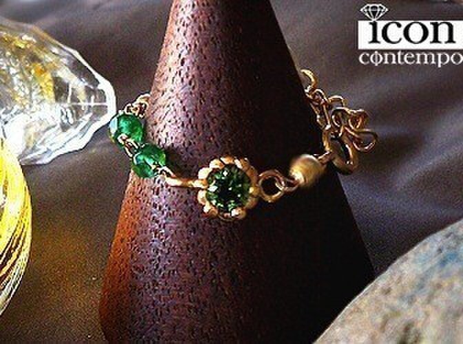 10YG,K14YG Moldavite & Emerald Flower Frame Chain Ring & Y Necklace