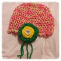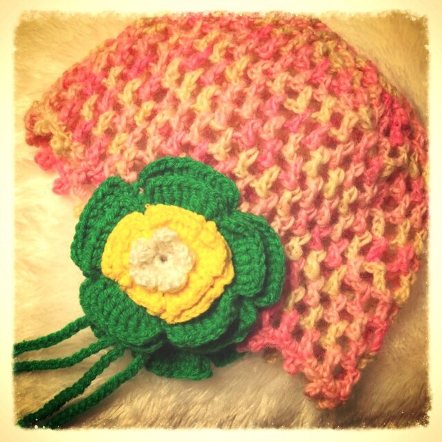 ピンクベースの毛糸に花モチーフの耳あてを付けた帽子です。