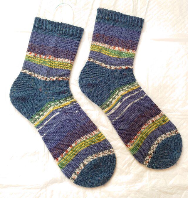ドイツ製 靴下用毛糸OPALと、ショッペルツイード糸で編んだメリヤス編みの靴下です。