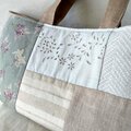 アンティーク手刺繍レース、ドイツのアンティークマングルクロス、リネン、ライラック模様コットンリネンなどをパッチワークしたトートバッグです