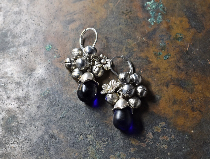 ウエディングビーズと呼ばれるボヘミアのアンティークビーズとたわわな鈴、カレンシルバーチャームを繋いだピアスです。