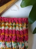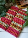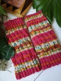 濃いストロベリーピンクにポツポツ入る白や緑や黄が可愛い、短めのスパイラル編みレッグウォーマーです。