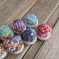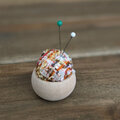 手織り生地をまるめた「たまこ」を小さな針山(ピンクッション)にしました。