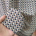 ・春から夏、秋のはじめにかけておすすめのやや薄手の生地。ホワイトの地にネイビーとオレンジの幾何学模様です。柄の大きさが小さめで、色合いもシックなため、どなたでも着こなしやすいです。