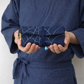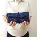 その技術を生かし、現代の日常で長く使っていただけるように素材は濃紺デニムを選び、銀泥で蜘蛛の巣デザインを金彩加工しました道中財布です。