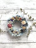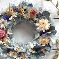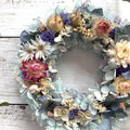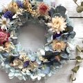 ドライフラワーの帝王貝細工やアジサイ・オレガノケントビューティーなどを使った涼しげなカラーのリースです。