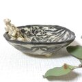 「掻き落とし」の技法でドクダミの模様を描いた手びねりの小皿に、ネコ耳ちびっこが座っています。