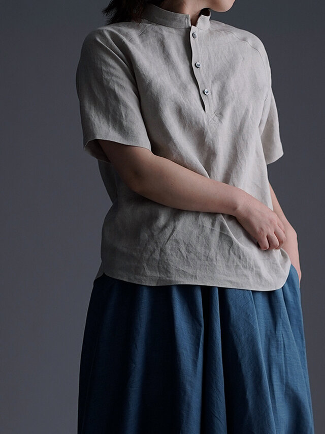 【Mサイズ】【wafu】自分用に3枚いきます。半袖リネンスタンドカラーシャツ 男女兼用/亜麻ナチュラル t038k-amn1-M