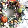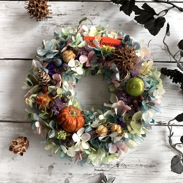 オレンジのカボチャにグリーンの青リンゴ、ブルーカラーのアジサイを合わせたハロウィンリースです。