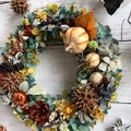 ドライフラワーのフーセンポピーやミモザ・帝王貝細工、ふうの実・松かさ・ピンクコーンなどの木の実、