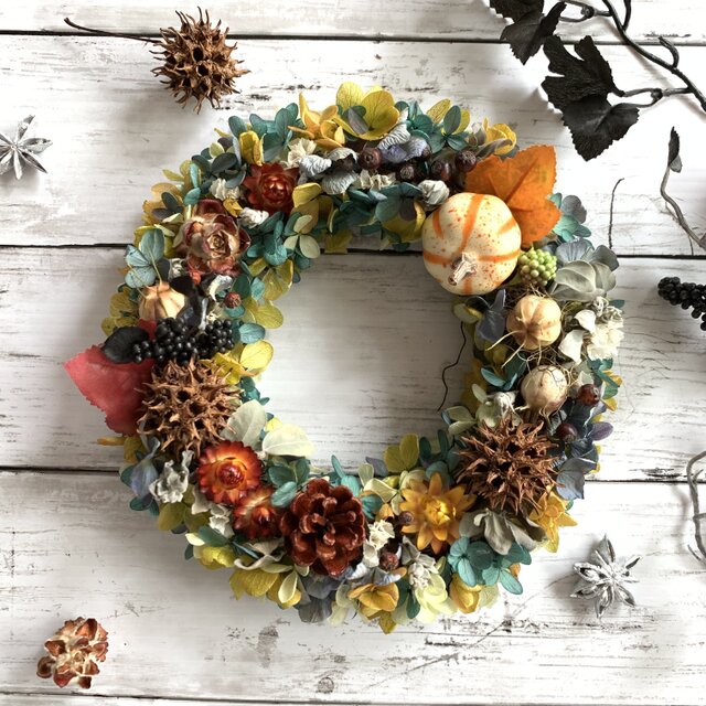 白のカボチャと木の実・アーティフィシャルフラワーのワイルドベリーなどを組み合わせたシックなハロウィンリースです。