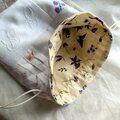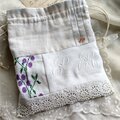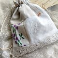 格子状に織られたリネンに丁寧に手刺繍されたモノグラムを使った巾着ポーチです。