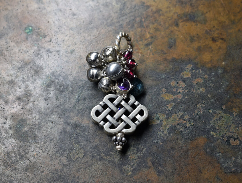 エンドレスノットとシルバー枠アメジストとインディゴブルーカイヤナイト、ガーネット、鈴を繋いだペンダントトップです。