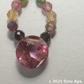 宝石質トルマリンAAAの極小ラウンドカットを5個ワイヤーに通してから、ファセットカットのピンクトパーズを通しました。