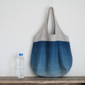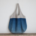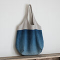 藍でグラデーションに染めたリネン生地で丸い大きなトートバッグをつくりました。海を感じさせる色味に染まりました。