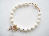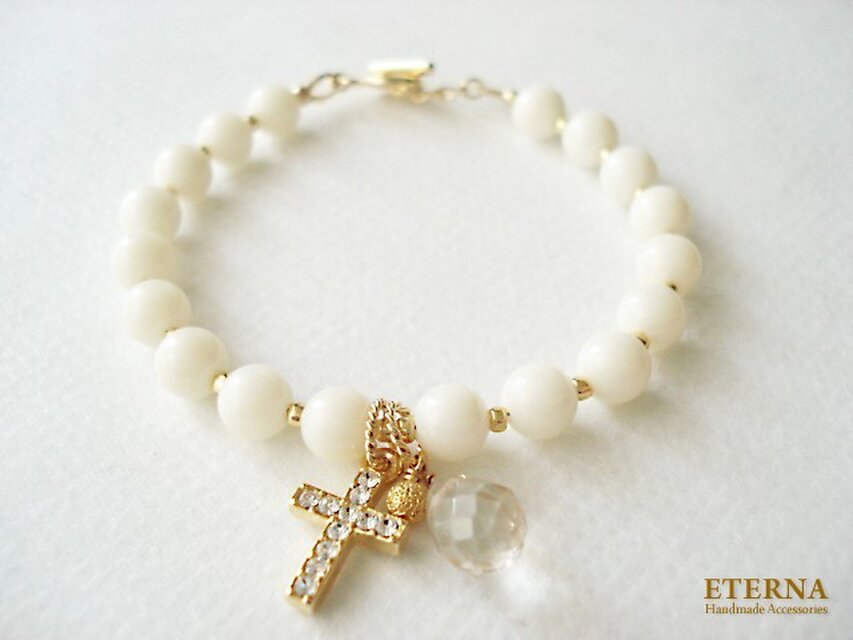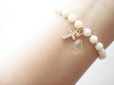 乳白色のホワイトコーラルをベースに、透明感溢れるドロップカットのシャンパンカラークォーツと、キラキラと輝くクロスチャームを組み合わせて上品で華やかなブレスレットに仕上げました。
