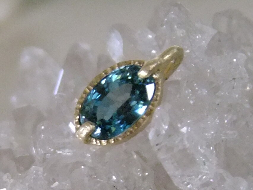 一見ブルーダイヤモンドやサンタマリアとも思えるようなカンボジア産ブルージルコン*綺麗な水色に合わせた柔らかい色味のK10ペンダントトップです*高硬度7.5から生まれる強いテリと高い分散度によりダイヤモンドのような虹色の煌めきも見られます*クラックやインクルージョンも無くアイクリーン、流通の少ないレアストーンをお楽しみ下さい*台座はテクスチャーを施したアンティーク調のマット仕上げ、こちらはトップのみの販売です。