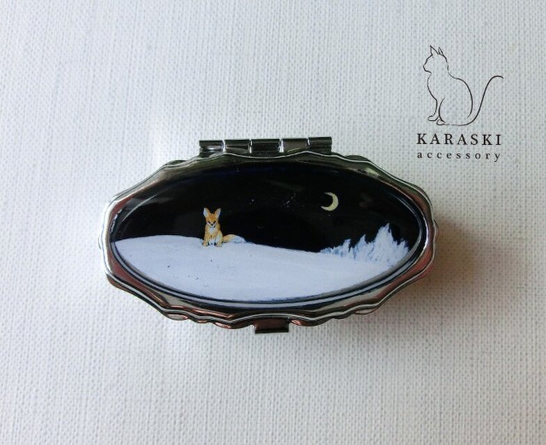 雪景色にキツネと三日月を描いたオリジナルイラスト(原画)を樹脂でとじこめました。