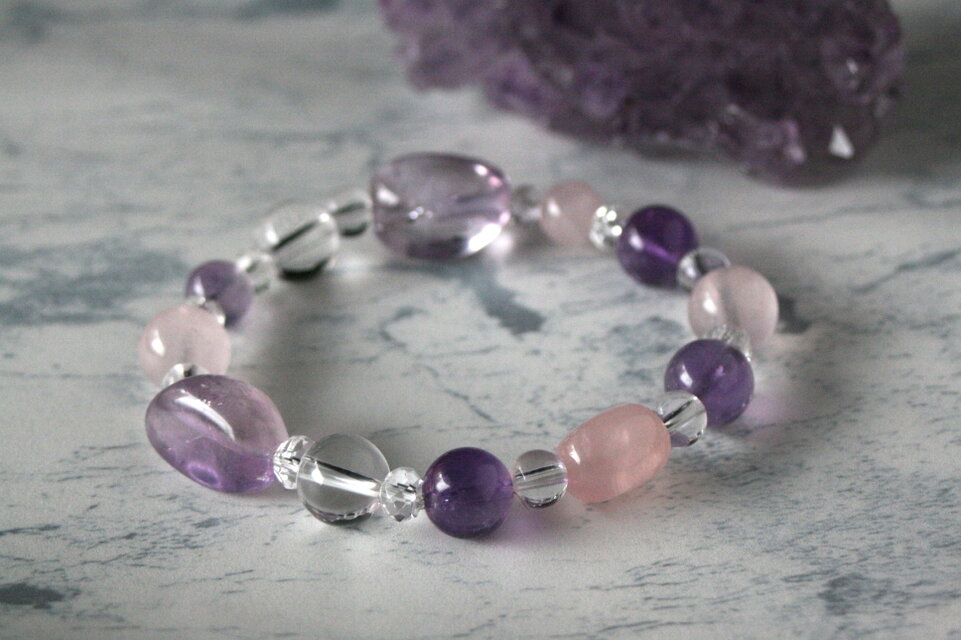 天然石アメジスト・クリスタルクオーツ(水晶)・ローズクオーツのゴムブレス。