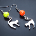 アンティークシルバーの跳ね猫シルエットモチーフにミックスオレンジとミックスイエローの暖色系配色のビーズを組み合わせたピアスです