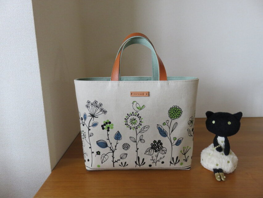 可愛らしい綿麻生地で、バッグ専用のシール式接着心を使ってしっかりと仕立てています。