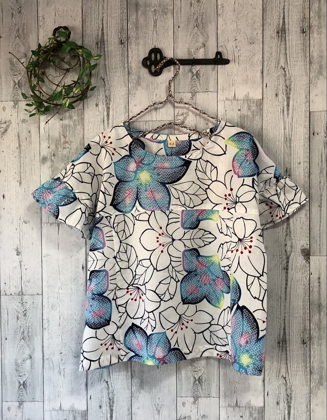 ☆ 浴衣フリル袖ブラウス 白に虹色の花♪