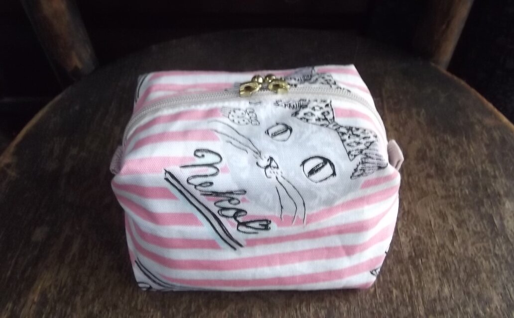 ピンクのボーダー柄にオシャレな猫さんのプリントでのオックス地で作ったキャラメル型のポーチです。