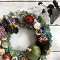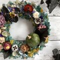 グリーンのカボチャとパープルのソーラーローズに黒のワイルドベリーをあしらった大人っぽい雰囲気のハロウィンリースです。