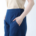 クロップド丈のインディゴ染めカジュアルカーブパンツです。裾の部分が切り返しになっており立体感のあるカタチになっています。ウエストはサイズ調整を考えて、後ろ半分にゴムが入っています。前半分はゴムが入っていないのですっきりとした印象です。