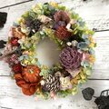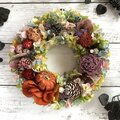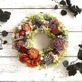 くすんだオレンジのカボチャにパープルのソーラーローズ、そして木の実をいくつも入れたハロウィンリースです。