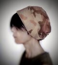 ベージュ系の柔らかい色味のオレンジ、ブラウンのカモフラ柄は