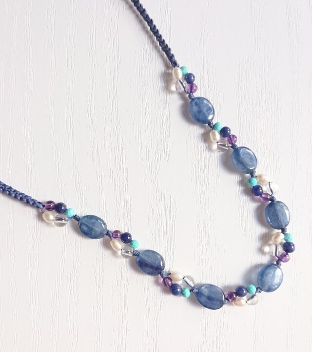 カイヤナイトの石の間には小さなアメジストやソーダライト、淡水パール等を散らして明るい色彩に仕上げています。