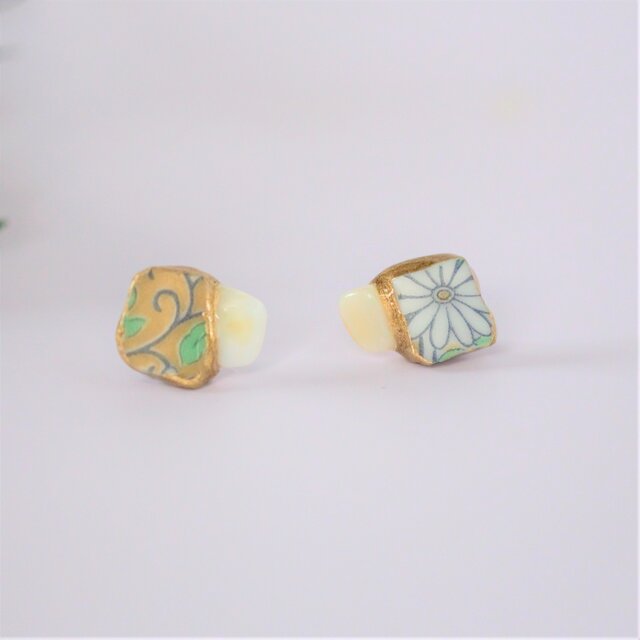 片方は白いお花、片方は落ち着いたマスタード色にリーフ柄の陶片に、白いマザーオブパールを合わせました。