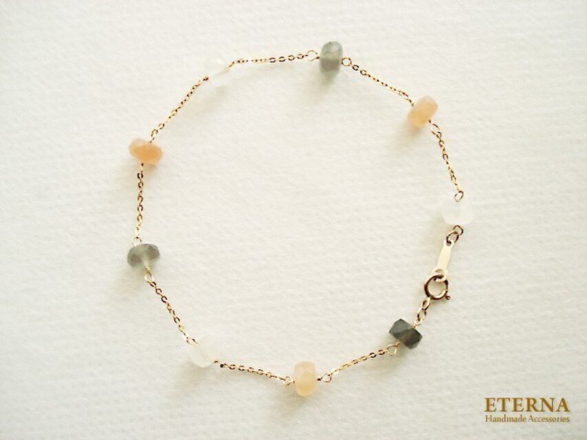 パステルトーンのムーンストーンと華奢なチェーンの組み合わせがお手もとを繊細で女性らしく演出します。