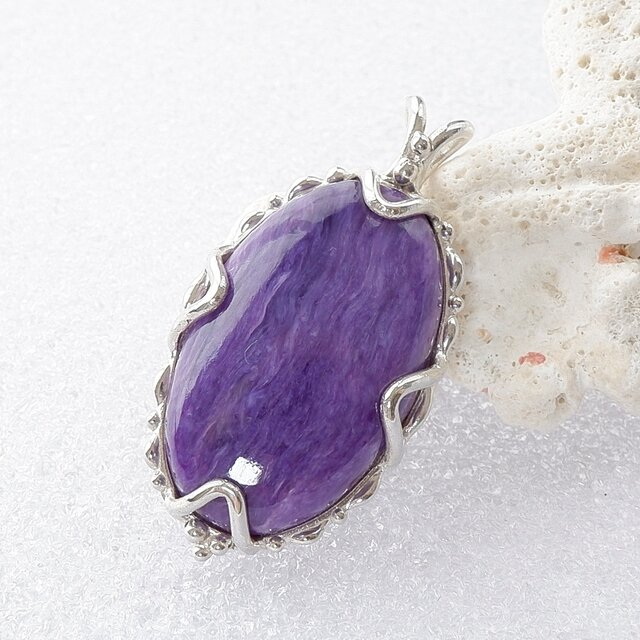 美しい紫色と複雑なシルク光沢が魅力的なチャロアイトのルースを、アンティーク風なデザインのペンダントに仕上げました。