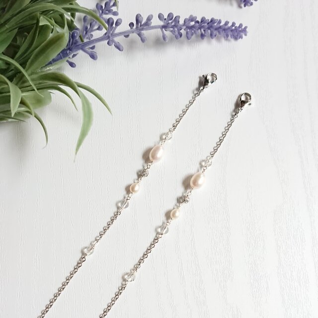 白いパールと透明の水晶の組み合わせは上品で清潔感があり、マスクの色・柄を選びません。