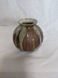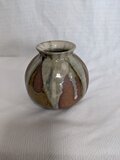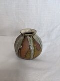 赤土に白い釉薬は上からビードロの釉薬は底下からそれぞれ流れるように掛け分けてます。中は白い釉薬がかけてあります。小さい割に沢山の花が生けられます。洋花でも和花でも枝ものでも合うと思います。