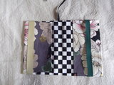裏地は紫の水玉柄で、本の厚さを調節できるように内側に折り込む形です。折り込み部分を挟むテープはベージのグログランテープを使っています。