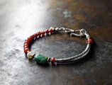 oldチベタンターコイズと金赤ホワイトハーツ、古代瑪瑙、湾曲したカレンシルバー、oldオリッサブラスなどで繋いだブレスです。