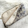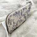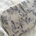 ラベンダー、グレー、ホワイトの濃淡でリーフと木の実の刺繍が施された上質のナチュラルなリネンのL字ポーチです
