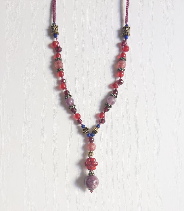使用パーツ:レピドライト 赤メノウ(染) ガーネット プラムクォーツ ラピスラズリ メタルビーズ(アンティークゴールド色) ワックスコード(エンジ色)